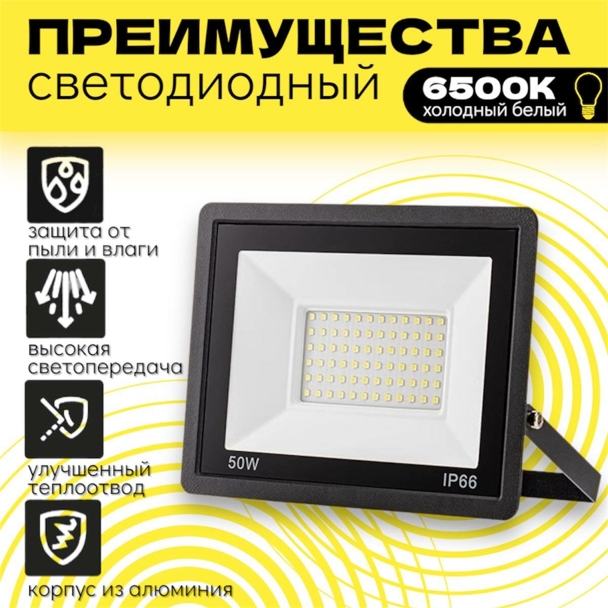 Прожектор светодиодный металлический уличный 50Вт/6500К/IP66 информация: