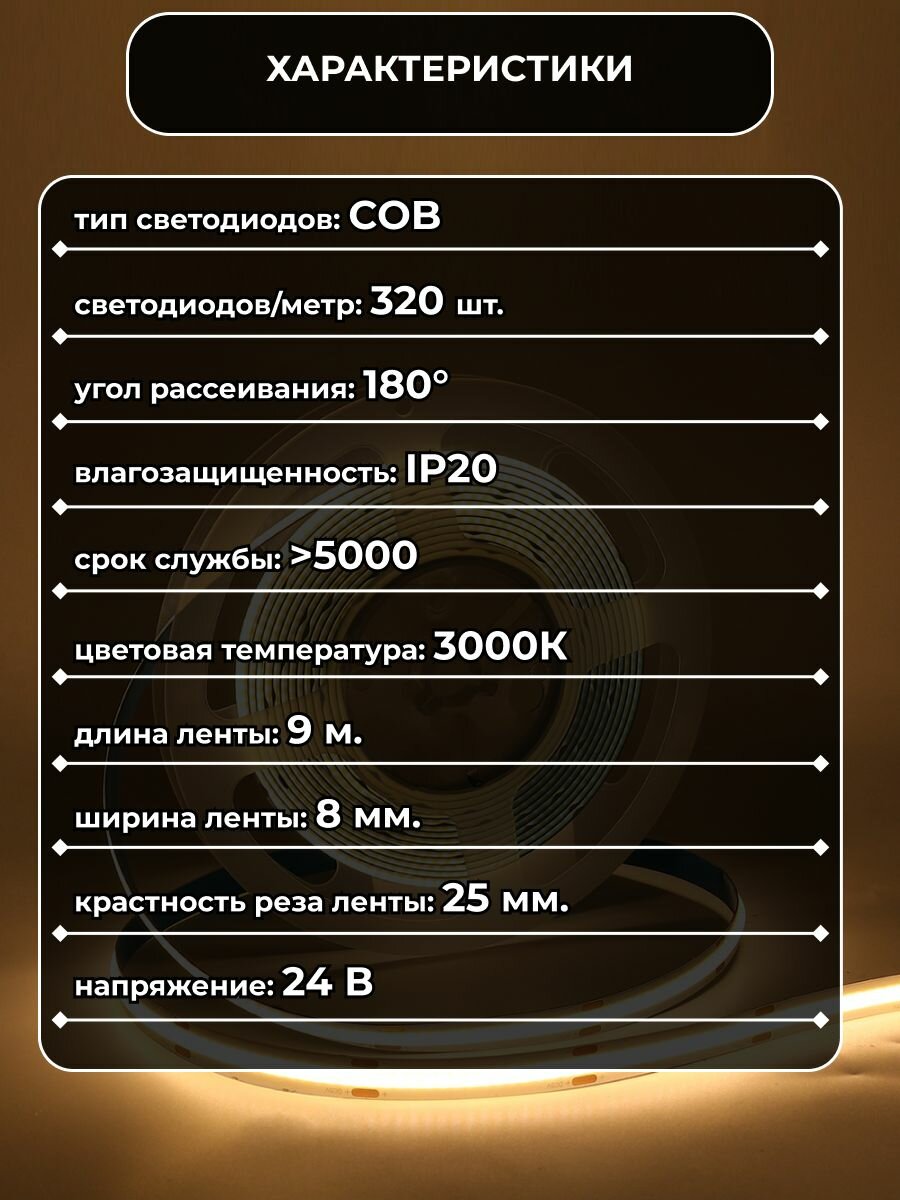 Светодиодная лента COB, теплый белый свет, 9 метров, 24V, 12W, LED 320/м информация: