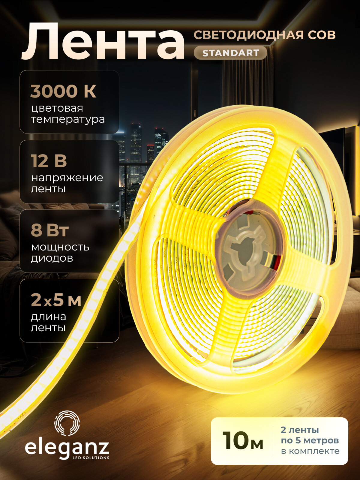 Светодиодная лента (комплект) СОВ Standard "Eleganz 12В" на самоклеящейся основе, 8 Вт , 310 LED, IP33 Теплый белый свет. Лента 10м (2шт. по 5 метров) информация: