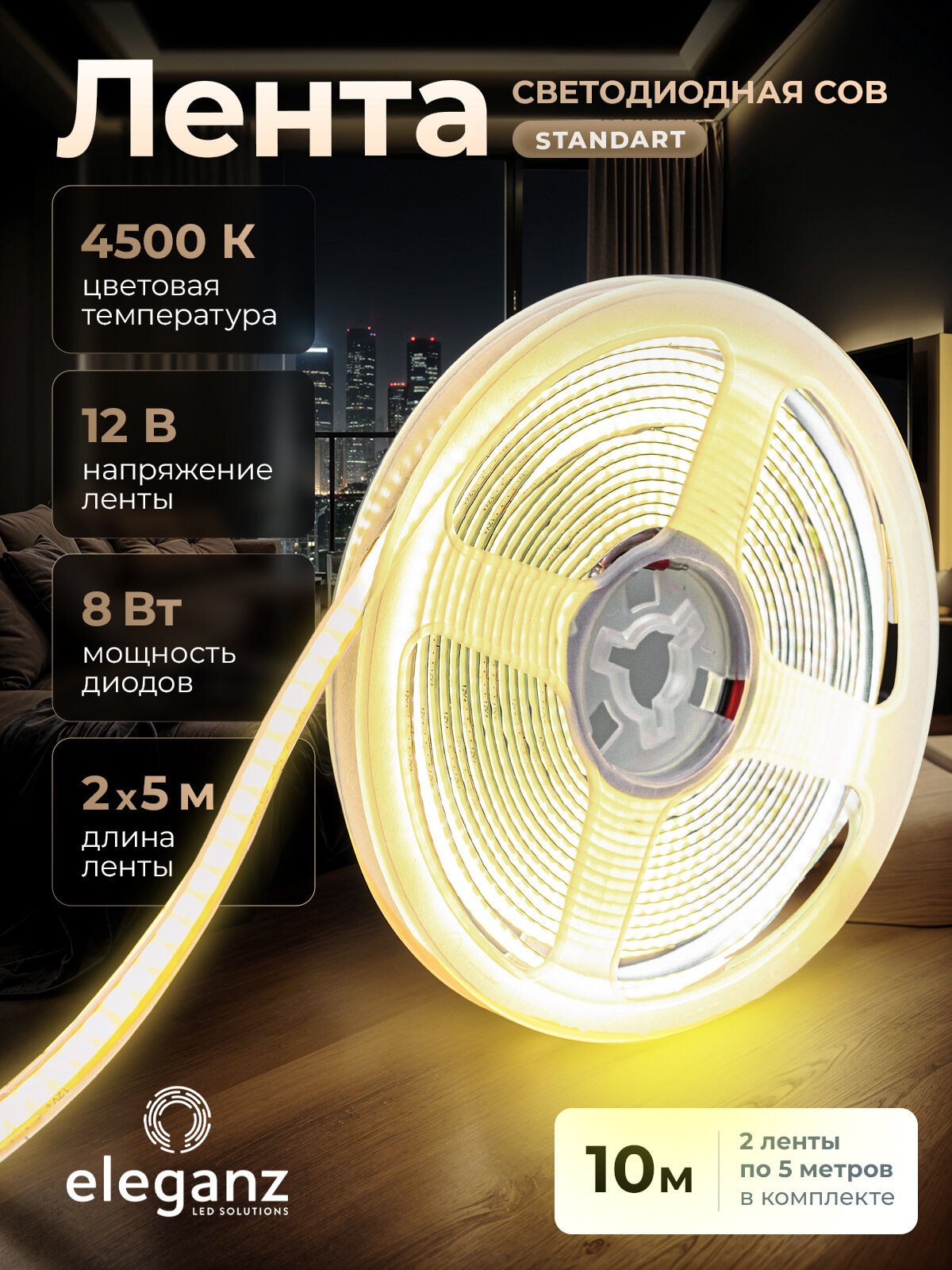 10 цен на Светодиодная лента (комплект) СОВ Standard "Eleganz 12В" на самоклеящейся основе, 8 Вт , 310 LED, IP33 Нейтральный белый свет. Лента 10м (2шт. по 5 метров)