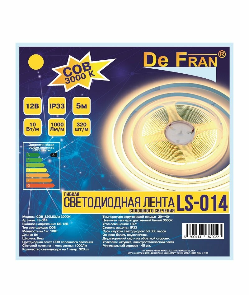 Лента светодиодная De Fran СОВ-320LED/м 3000К (арт. LS-014) 12В 1000Лм 10Вт/м 5м*8мм IP33 теплый белый информация: