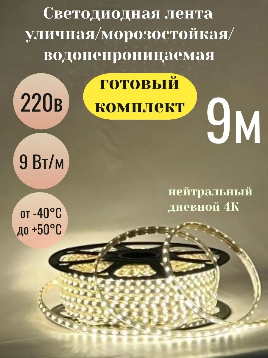 Светодиодная лента водостойкая комплект 9м, 9Вт, дневной свет 4К информация: