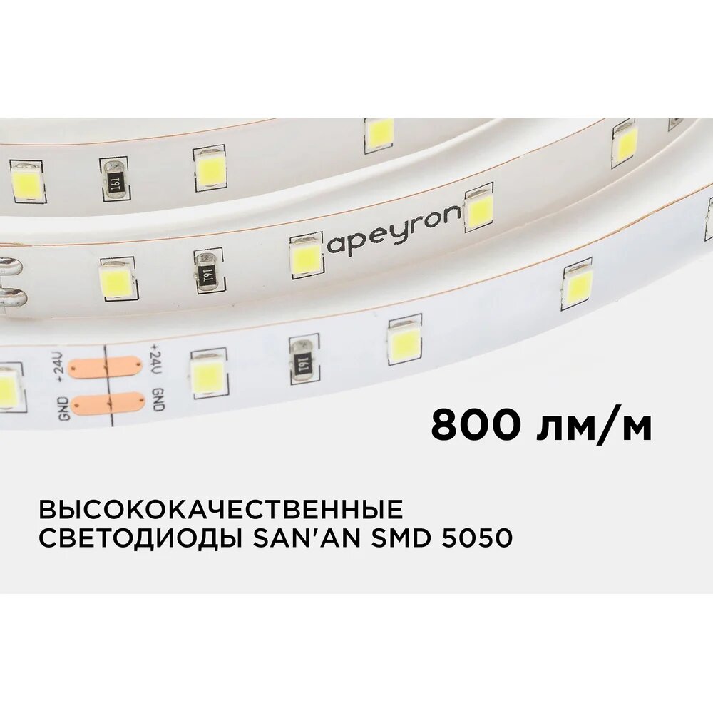 Светодиодная лента Apeyron 12В СТ 8Вт/м smd2835 60д/м 800Лм/м дневной белый (5 м)