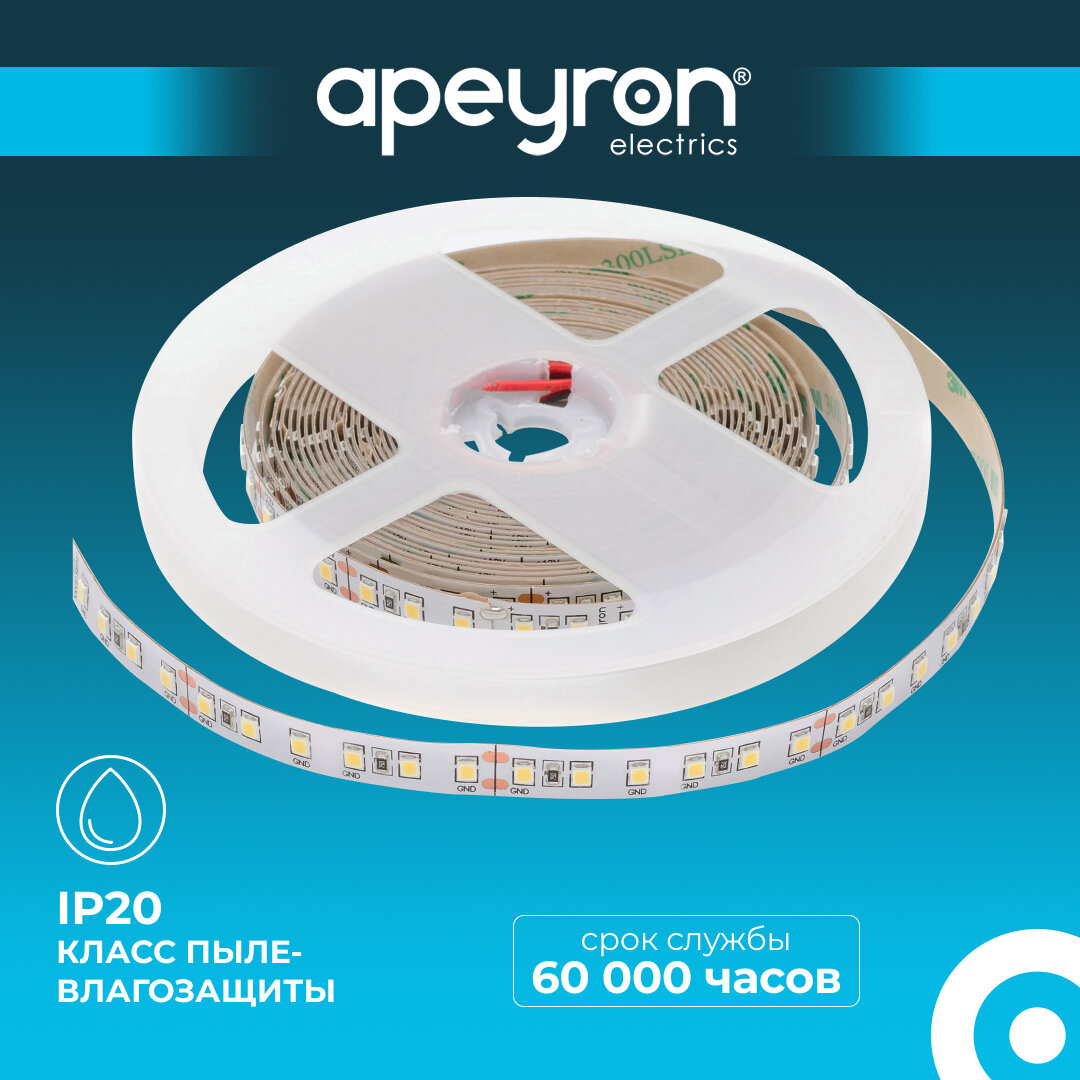10 цен на Яркая светодиодная лента Apeyron 00-342 24В, обладает белым цветом 4000K, 1500 Лм/м, 120д/м, 16Вт/м, smd2835, IP20, 5 м, подложки 10 мм