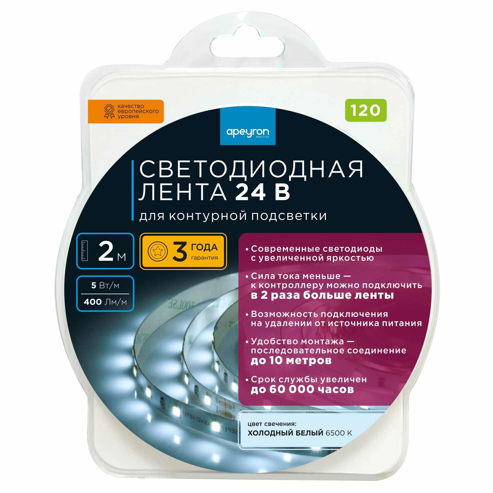 Лента светодиодная 12В Apeyron, 9,6 Вт/м, smd 3528, 120 д/м, IP20, 600 Лм/м, ТБ (5м)