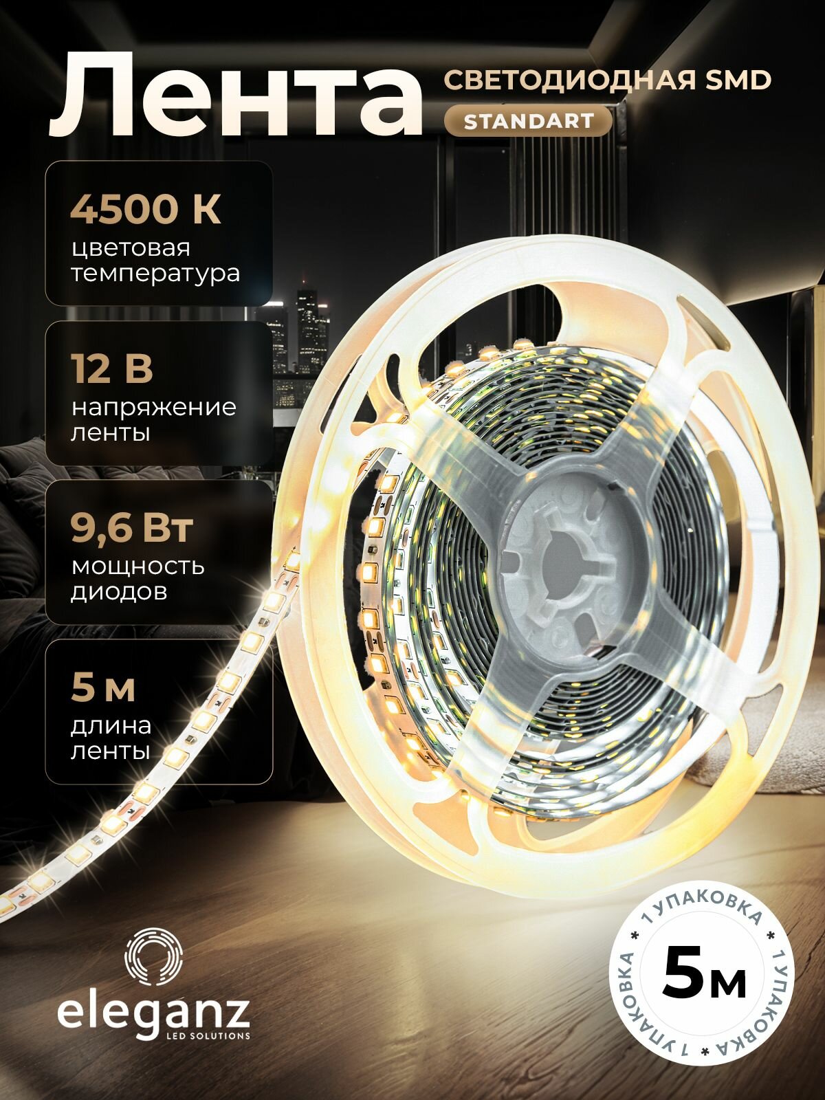 Светодиодная лента Standard "Eleganz" 12В на самоклеящейся основе, 9.6Вт 2835, 120 LED, нейтральный белый IP20 информация: