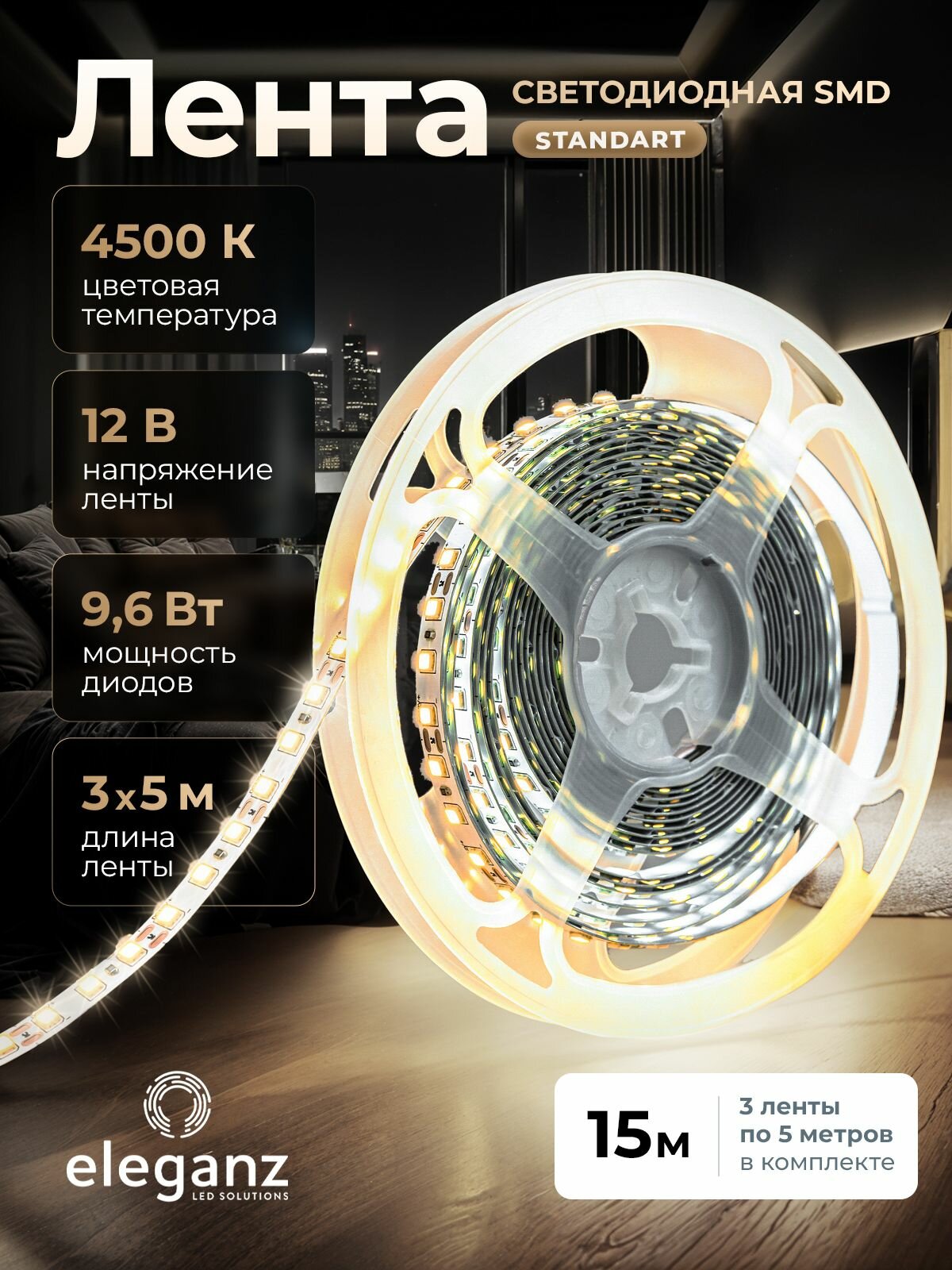 10 цен на Светодиодная лента Standard "Eleganz 12В" на самоклеящейся основе, 9,6 Вт 2835, 120 LED, IP20 Нейтральный белый свет (3шт. по 5 метров)
