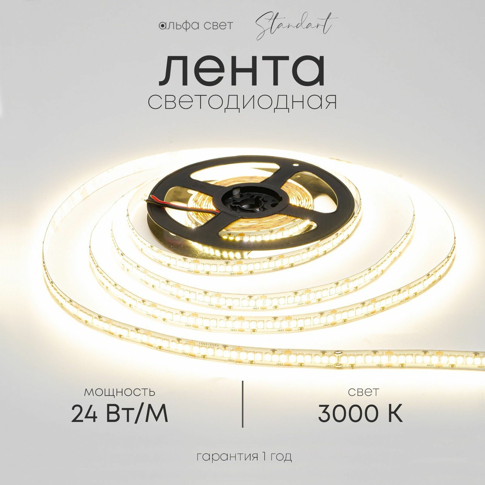 Светодиодная лента 24Вт, 24В, 3000К (тёплый свет), 2800 лм/м, IP20, 5 метров, Альфа Свет информация: