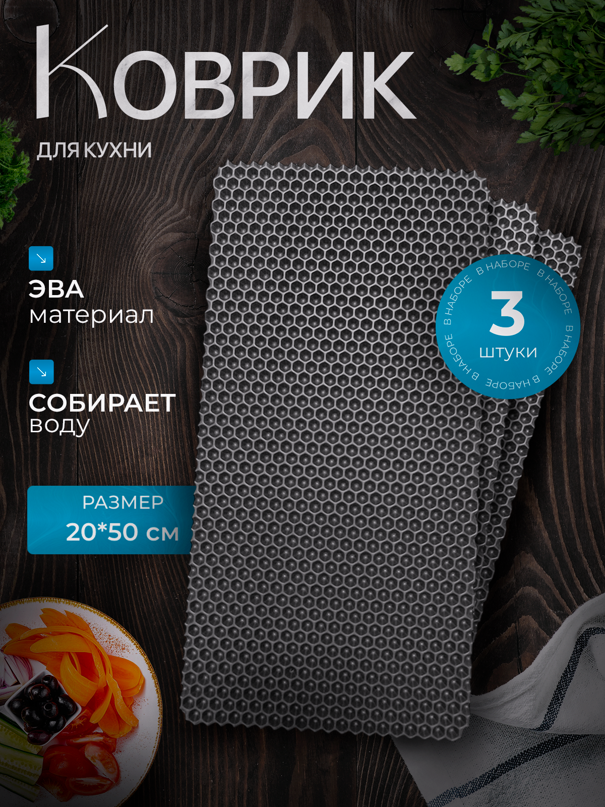 Отзывы на Набор Эва ковриков для сушки посуды из трех штук, 20х50см , серые соты / Для кухни / Eva, Ева