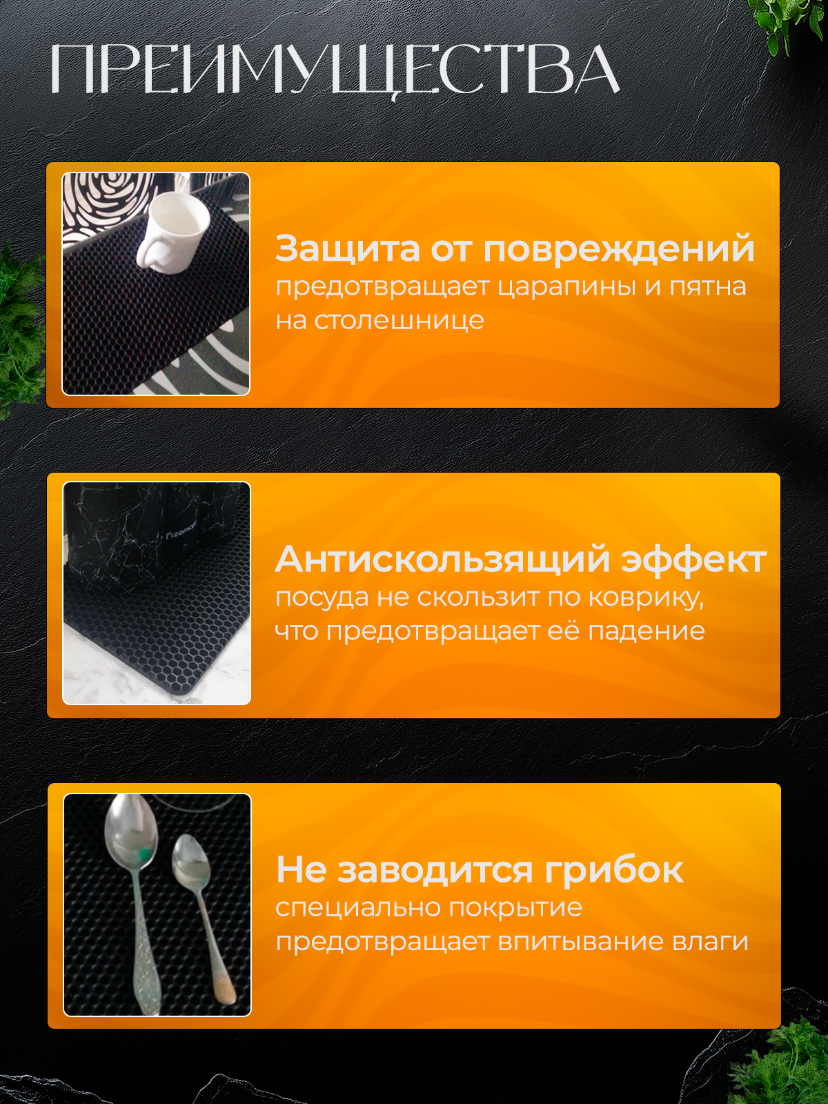 Барный коврик 20х40 см для сушки посуды 3 шт, черные соты 251 ₽