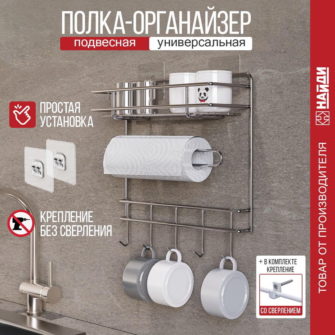 10 цен на Органайзер для кухни, специй НАЙДИ Держатель для бумажных полотенец. подвесной без сверления 310х102х325 мм. Хром