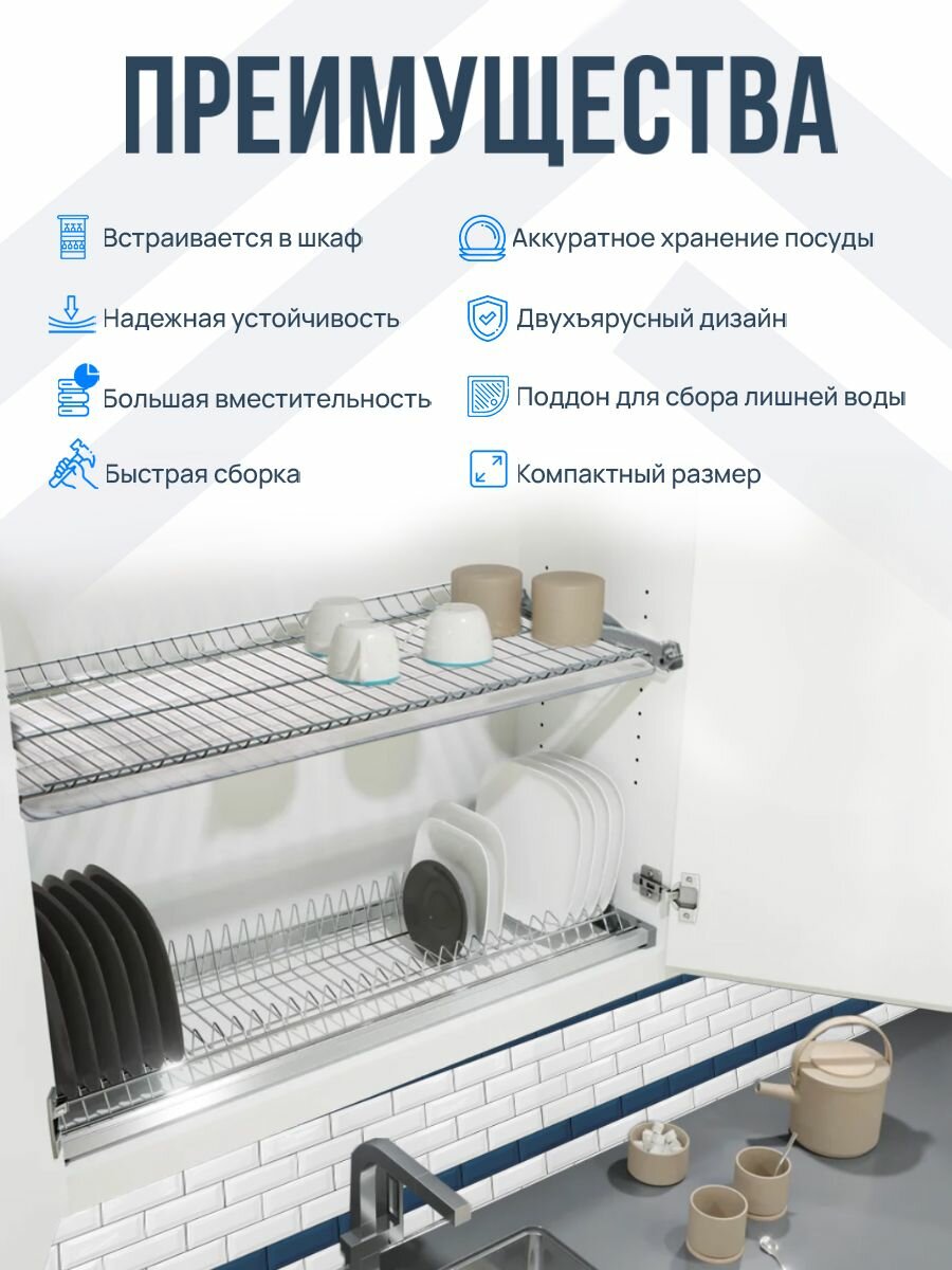 10 цен на Сушилка для посуды в шкаф 90 см, серая, двухъярусная, с поддоном, сталь