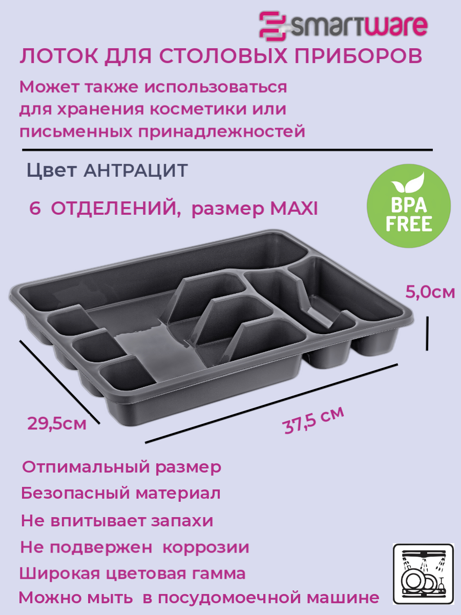 Лоток для столовых приборов, пластик, Smartware Maxi, Anthracite, 335х260х45 мм информация: