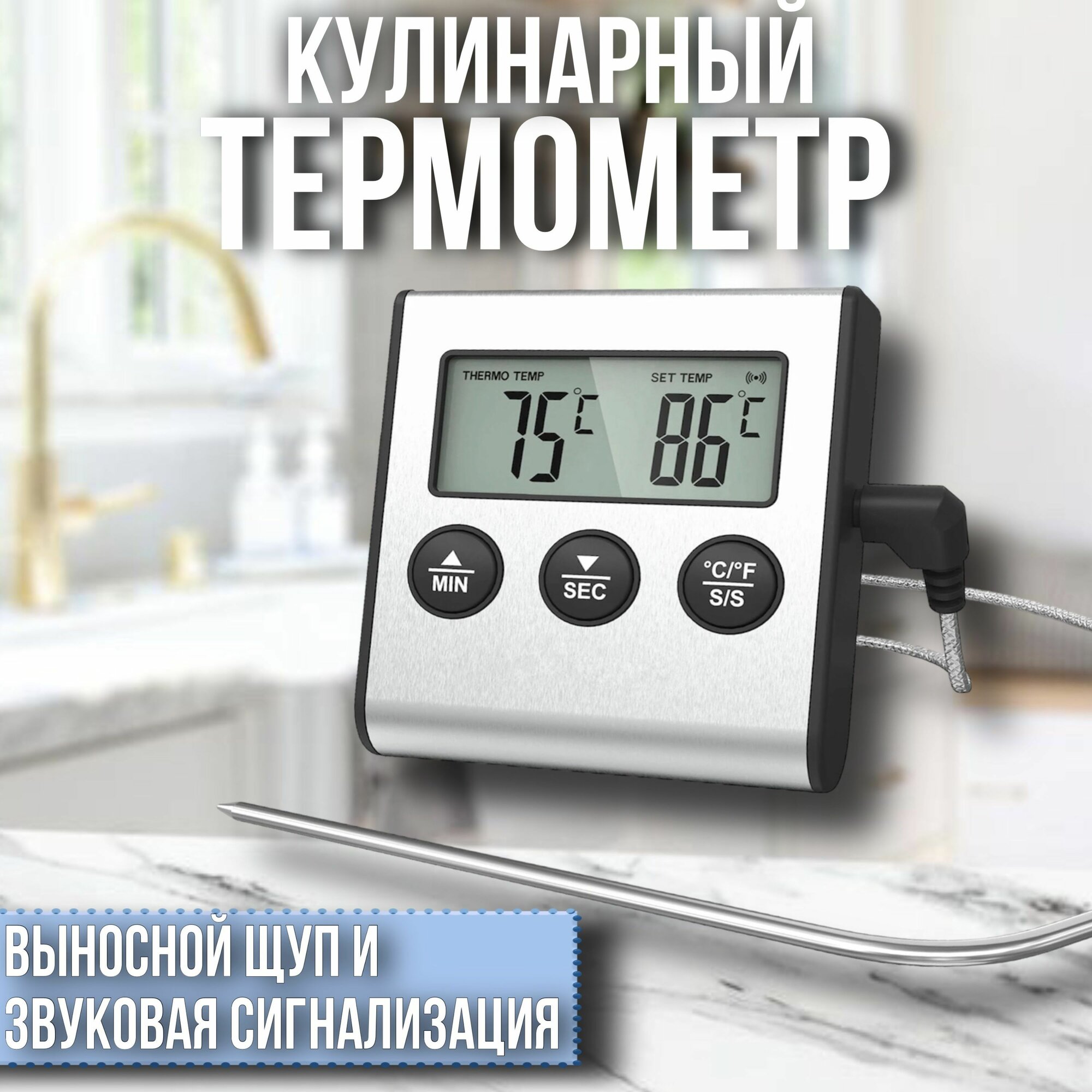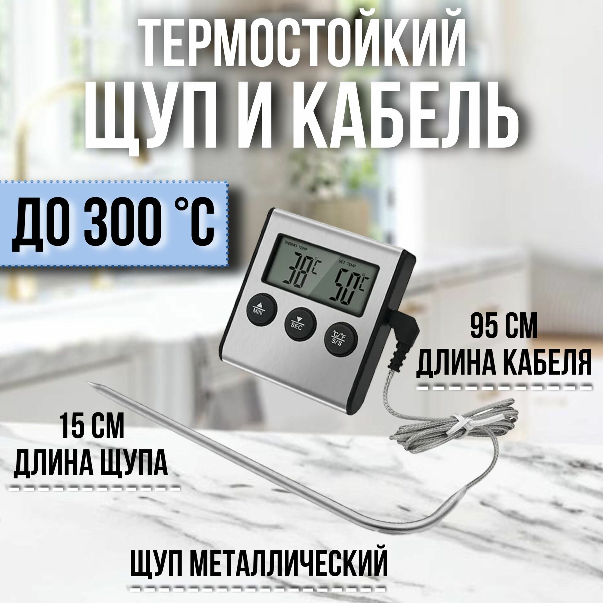 Кулинарный термометр электронный со щупом из нержавеющей стали, термометр для еды, мяса, вина, провод 1 метр / таймер кухонный