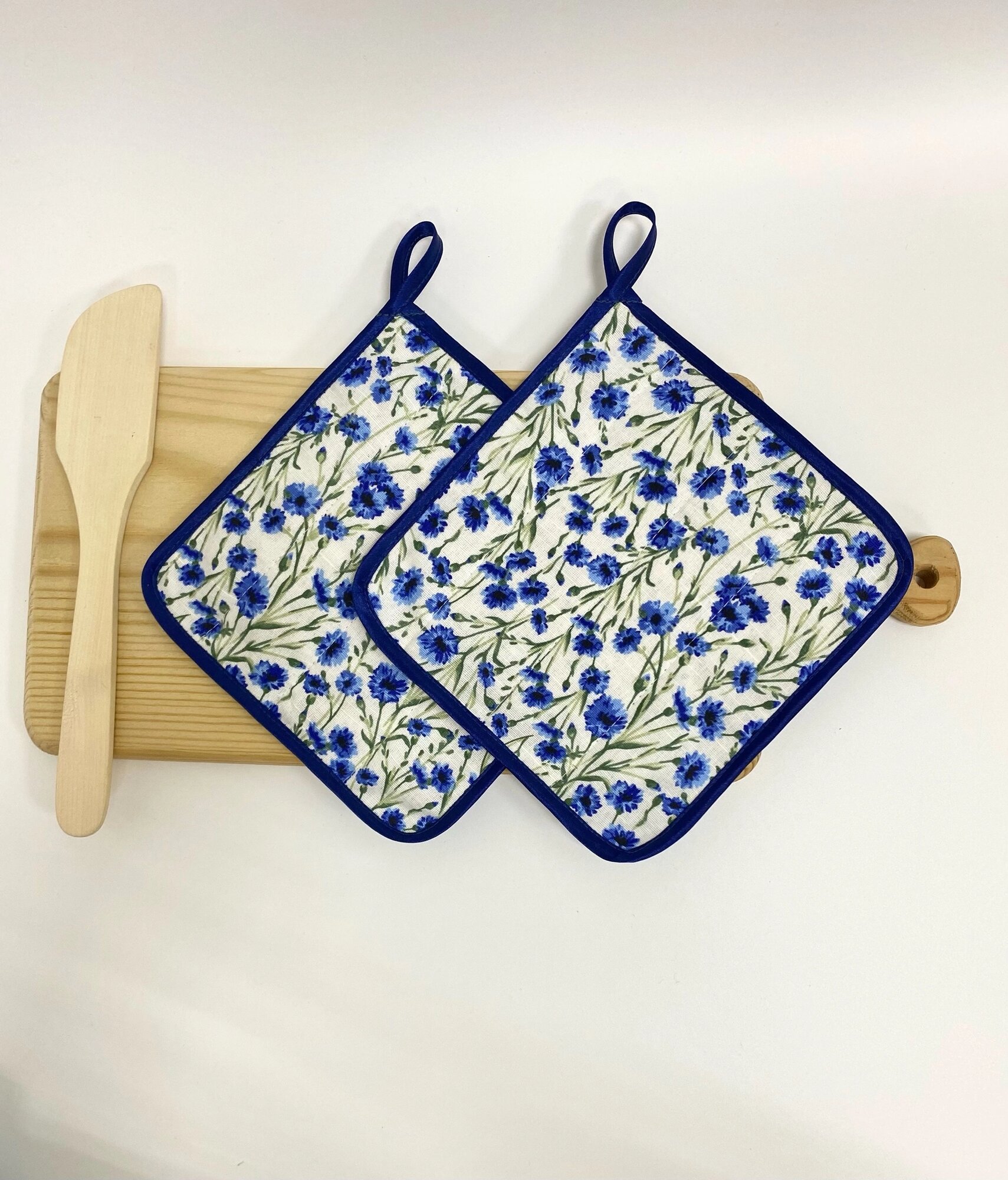 Прихватки, ткань лен Васильки, набор 2 шт, ручная работа, размер 19*19, тройной ватин, плотные информация: