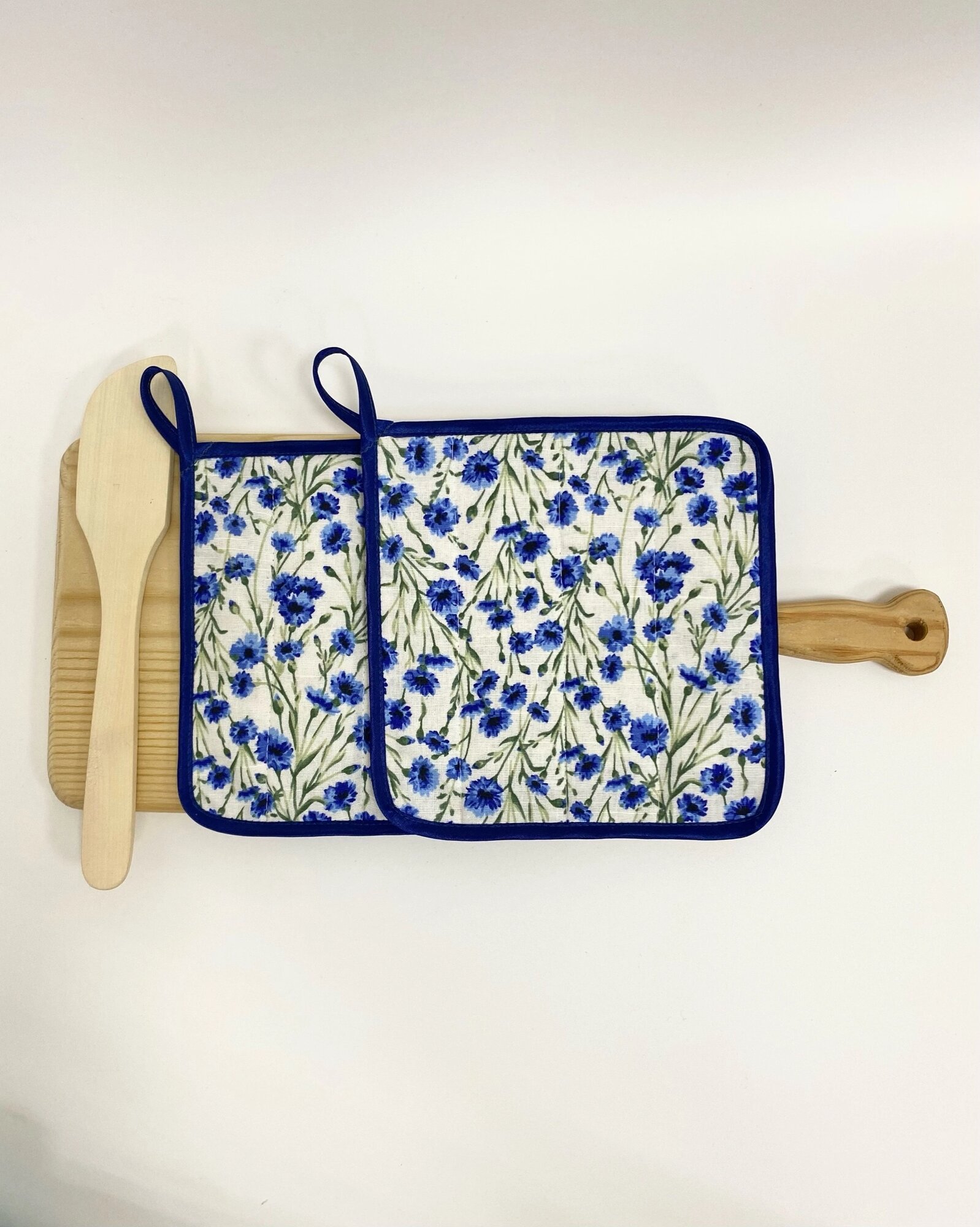 10 цен на Прихватки, ткань лен Васильки, набор 2 шт, ручная работа, размер 19*19, тройной ватин, плотные