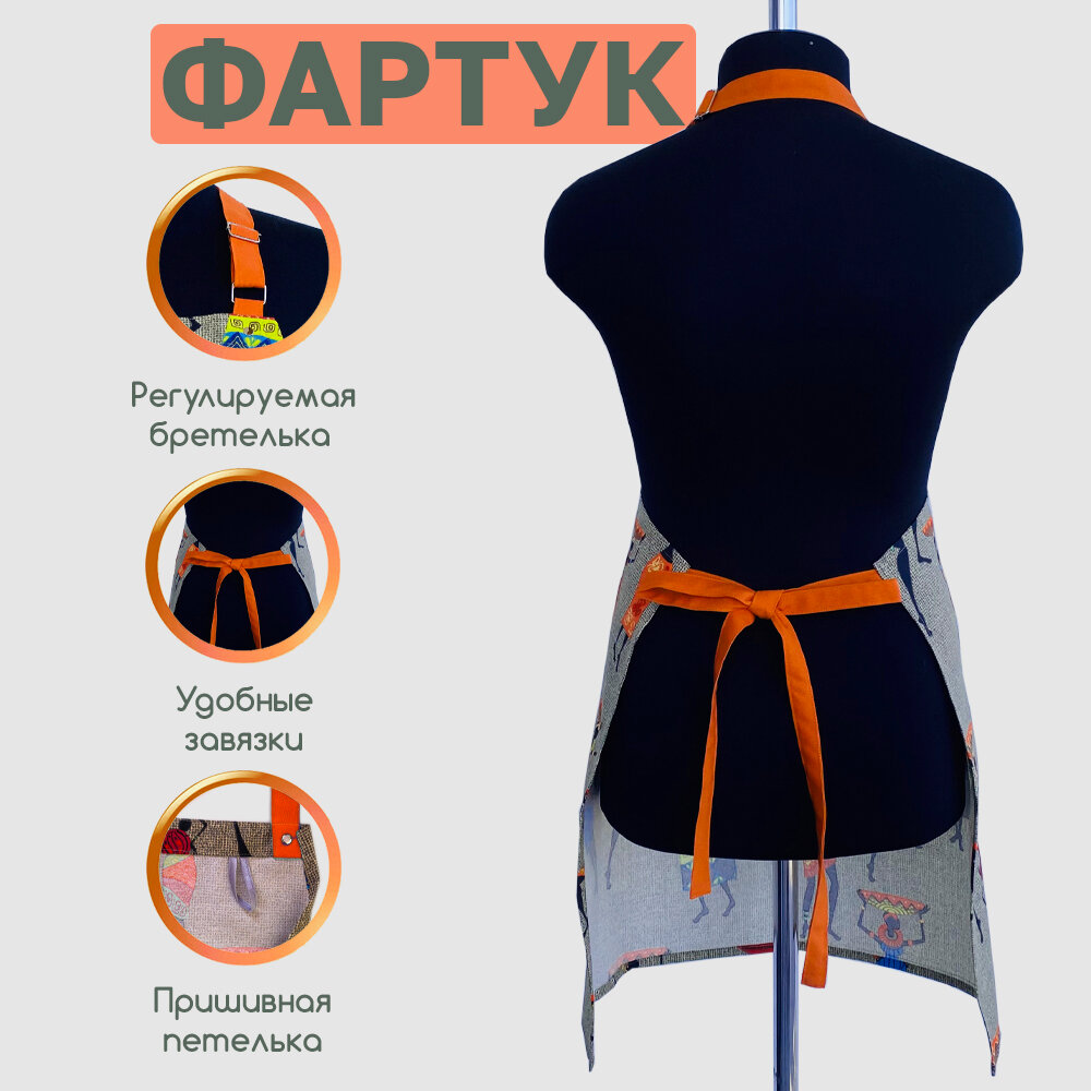 Фартук кухонный женский "Африканские мотивы", цвет Хаки с бретельками и поясом оранжевого цвета. информация: