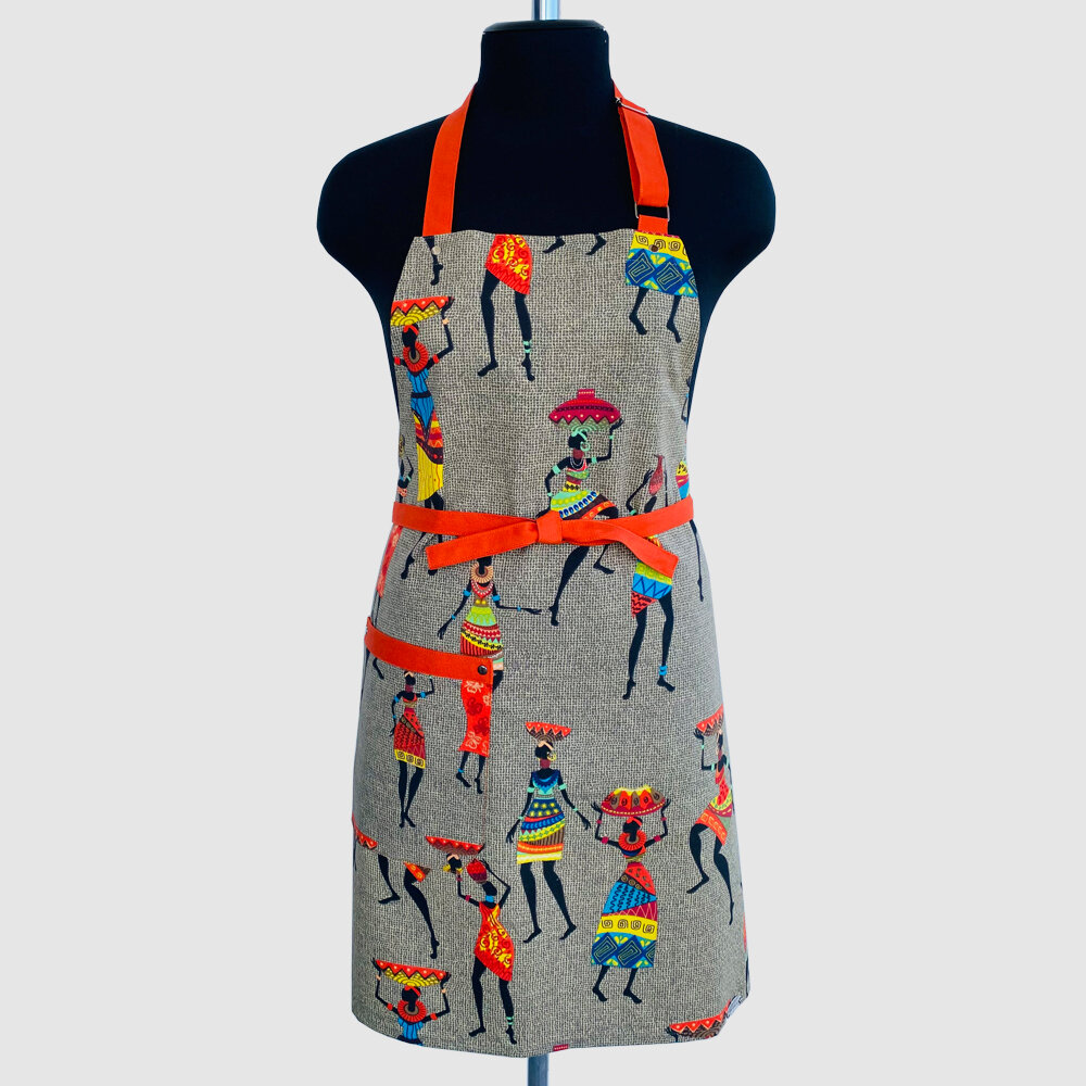 Отзывы на Фартук кухонный женский "Африканские мотивы", цвет Хаки с бретельками и поясом оранжевого цвета.