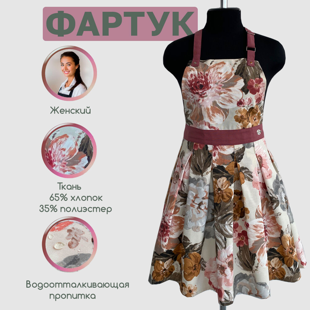 Отзывы на Фартук кухонный, поварской, с водоотталкивающей пропиткой, принт "Пионы" с бретельками и поясом цвета фламинго.