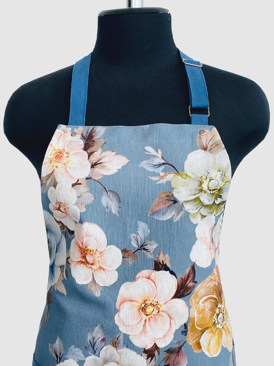 Отзывы на Фартук кухонный, поварской, с водоотталкивающей пропиткой, принт "Жасмин" с бретелькой синего цвета.