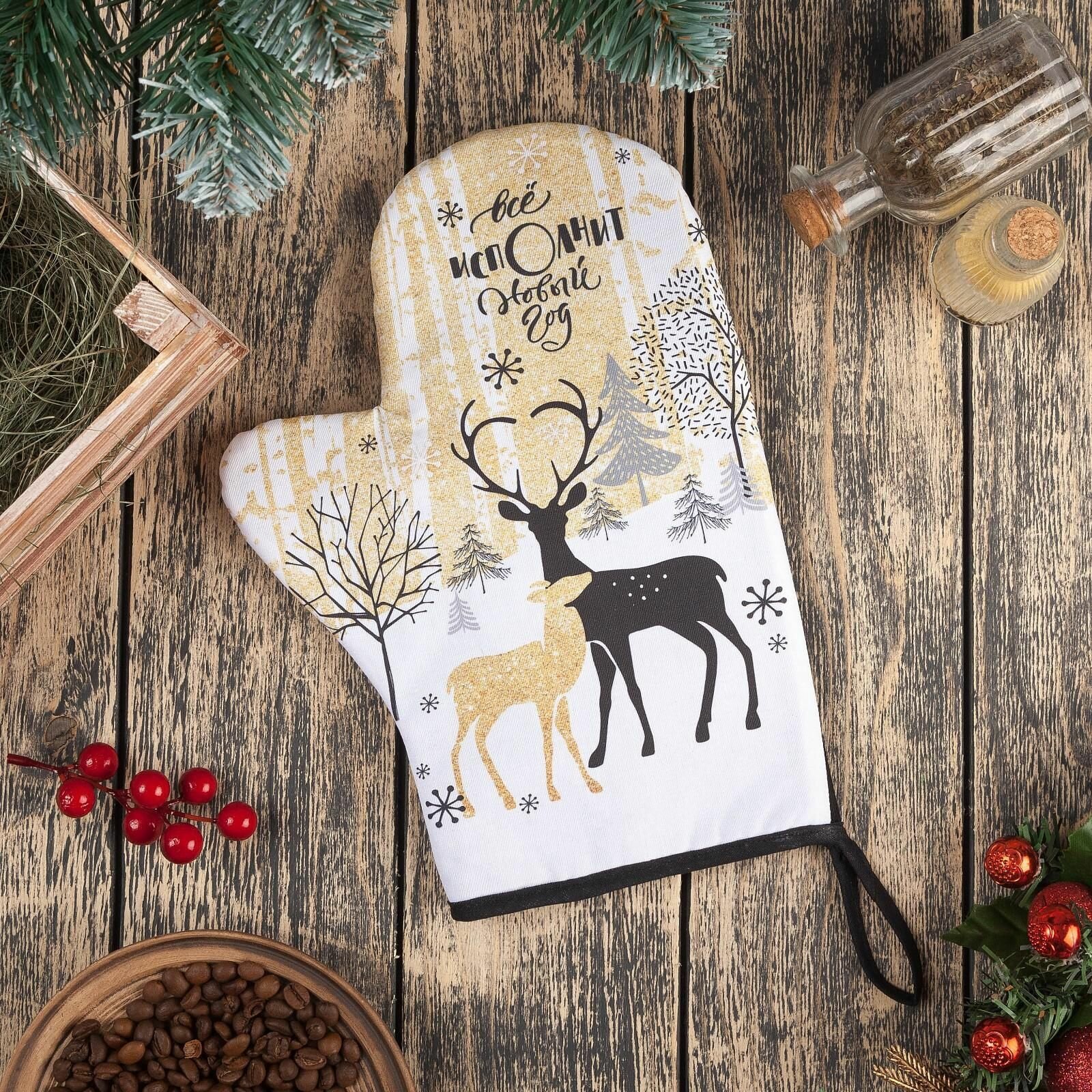 10 цен на Варежка-прихватка Новогодние олени 20 28 см, саржа, 100% х/л, ватин 250 г/м
