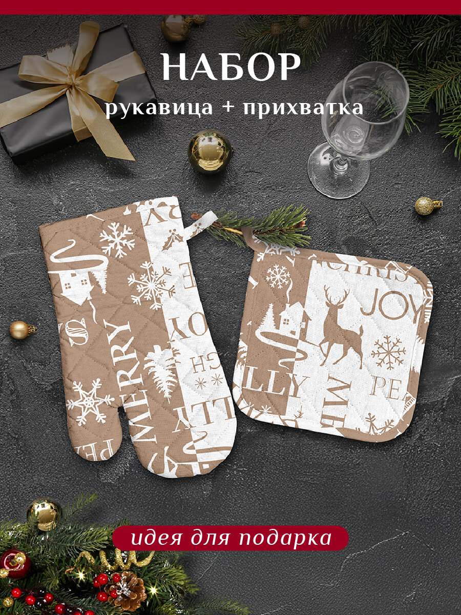 10 цен на Набор кухонный Василиса рукавица + прихватка, Рогожка, хлопок 100%, Новогодние олени на бежевом