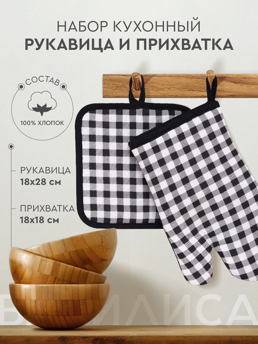 10 цен на Набор кухонный Василиса Рукавица и прихватка, хлопок 100%, Клетка, Черно-белый