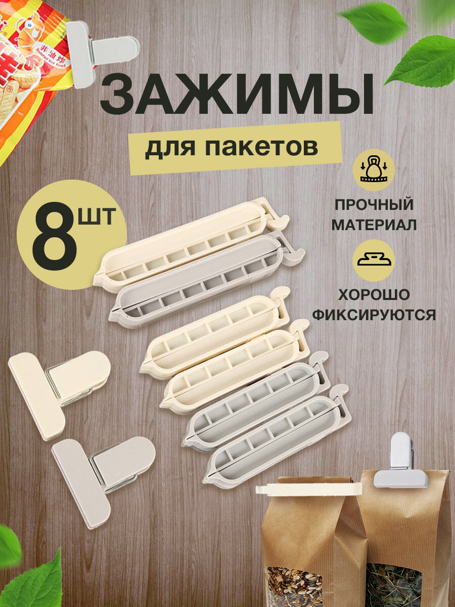 Зажимы для пакетов кухонные для хранения продуктов пластиковые универсальные набор 8 штук информация: