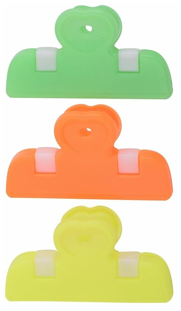 Зажимы для пакетов Мультидом, 3 штуки, размер 65 мм, цвета зеленый, оранжевый и желтый информация: