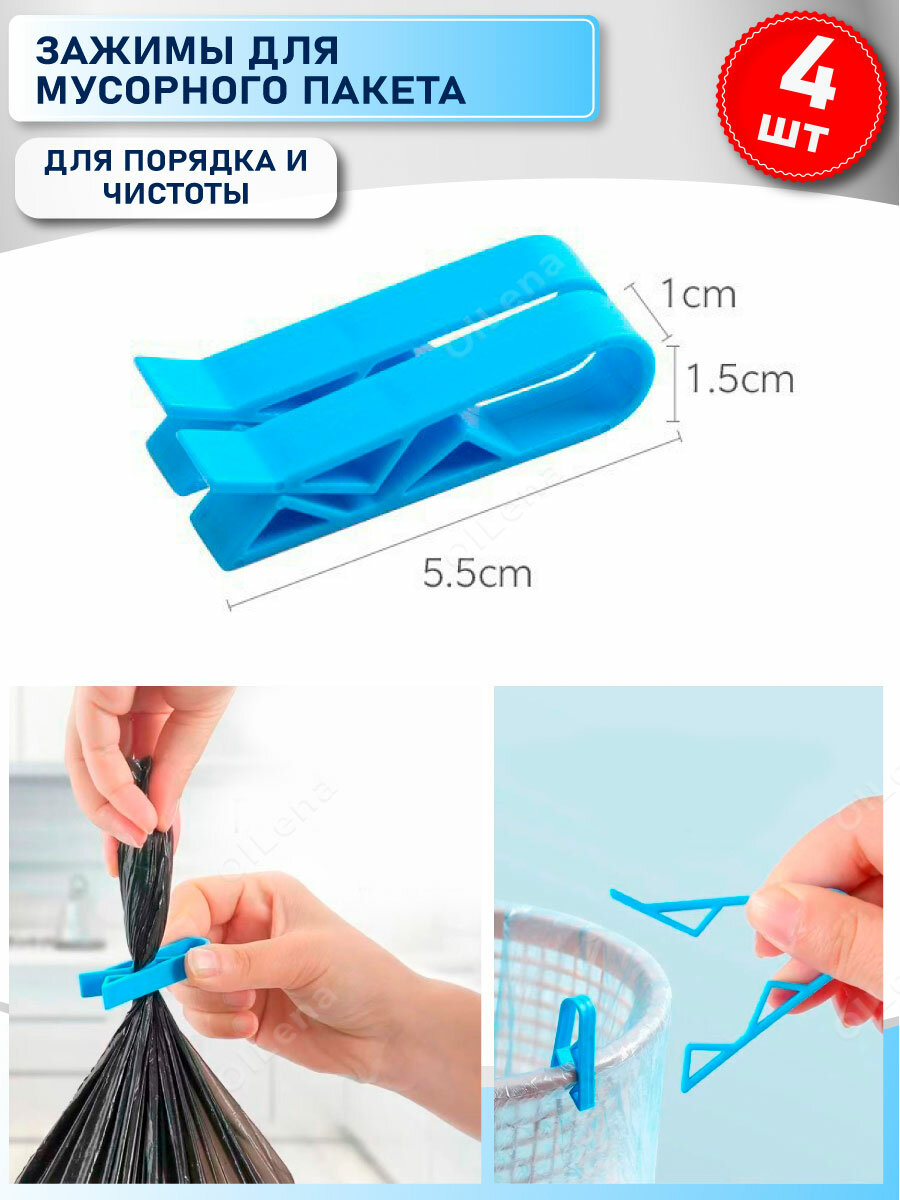 OlLena / Набор фиксаторов для мусорных пакетов / Зажимы для мусорных мешков, 4 шт, голубые 365 ₽