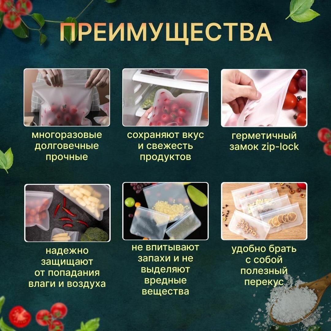 Силиконовые пакеты для заморозки и хранения продуктов с замком, 4 шт. в комплекте информация: