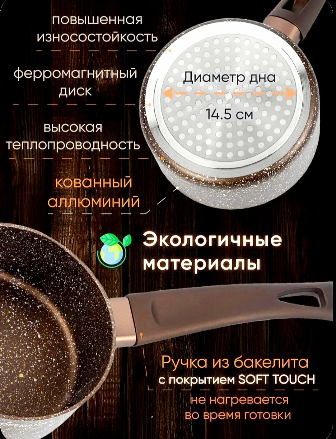 Ковш с ручкой HOFFMANN 16см. Коричневый. Мраморное антипригарное покрытие информация: