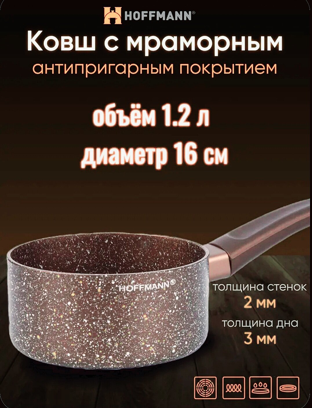 10 цен на Ковш с ручкой HOFFMANN 16см. Коричневый. Мраморное антипригарное покрытие