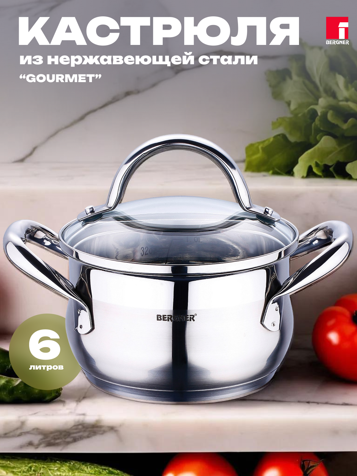 Кастрюля нержавеющая сталь, Ø24X13,5 см, 6,0 л, Gourmet, стеклянная крышка, BERGNER информация: