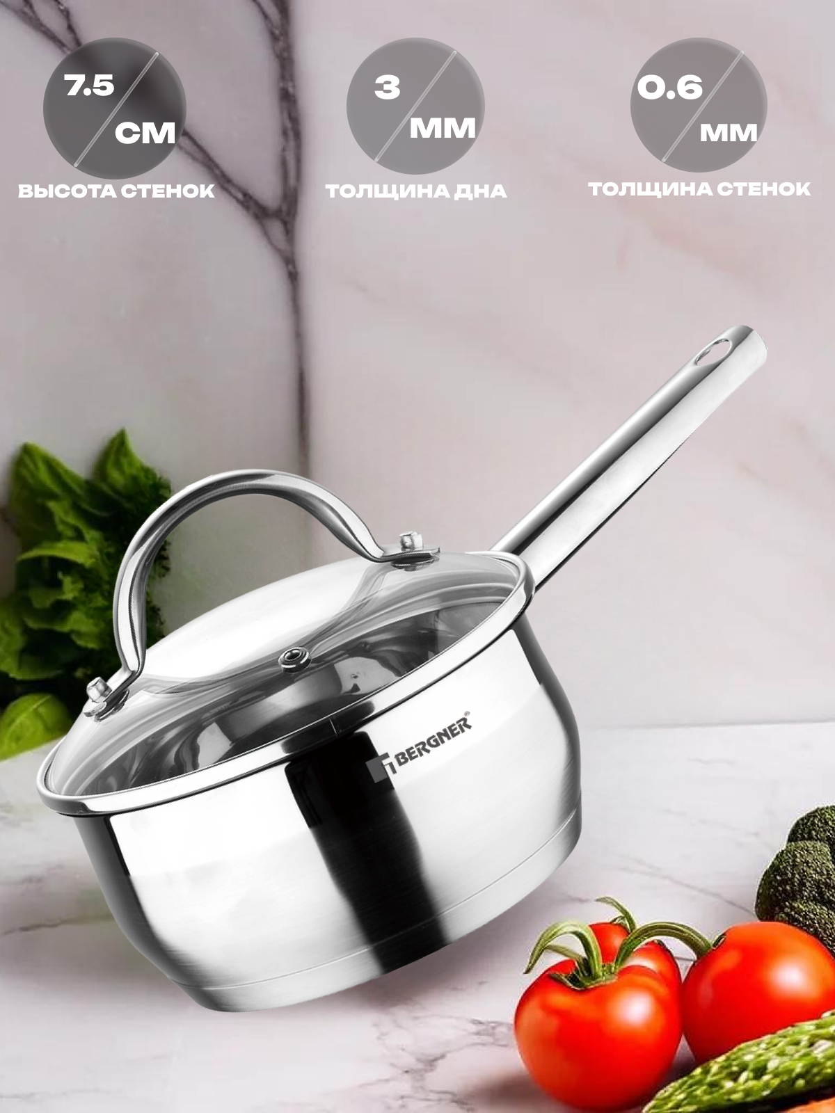 Ковш нержавеющая сталь, Ø16X7,5 см 1,3 л, Gourmet, стек. крышка, BERGNER, арт. BG-33990-MM информация: