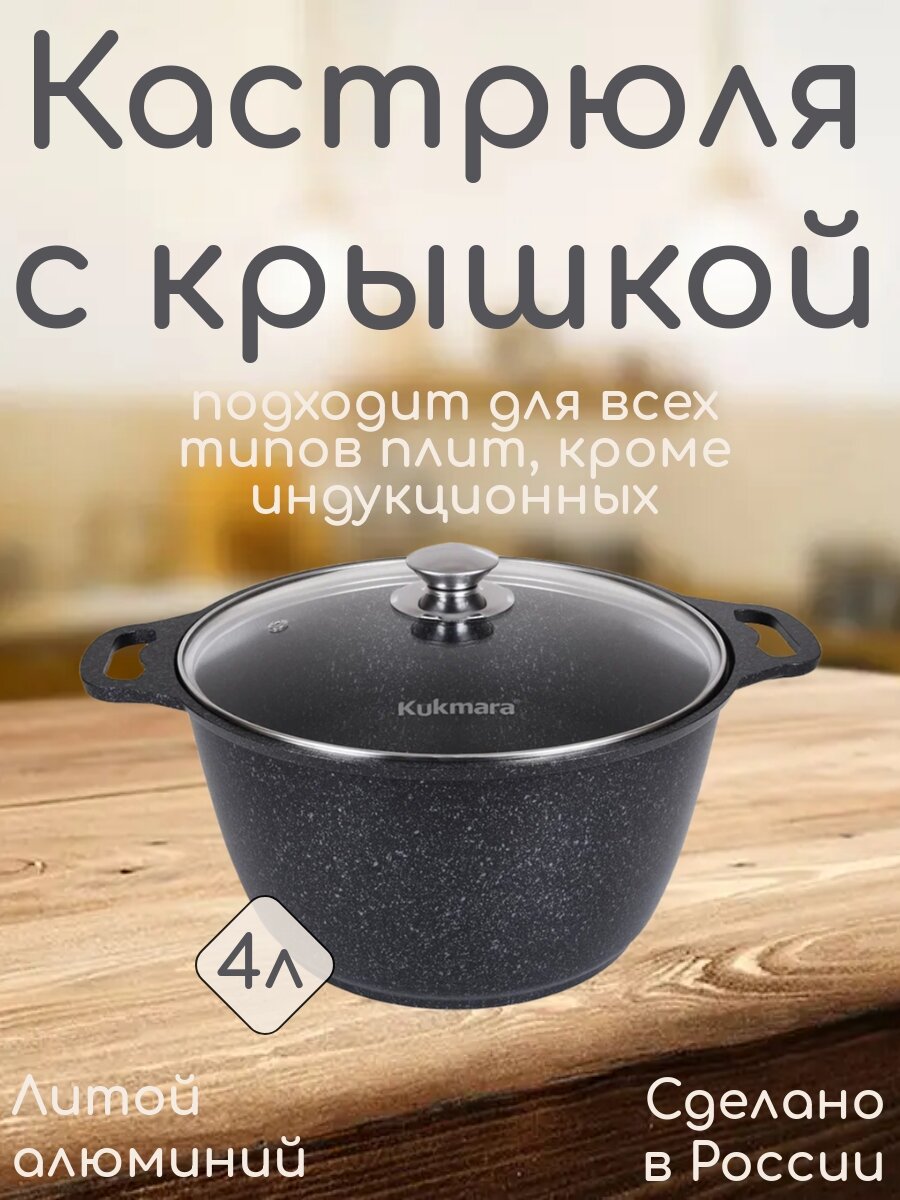10 цен на Кастрюля "Kukmara" 4л. со стеклянной крышкой, с антипригарным покрытием, темный мрамор