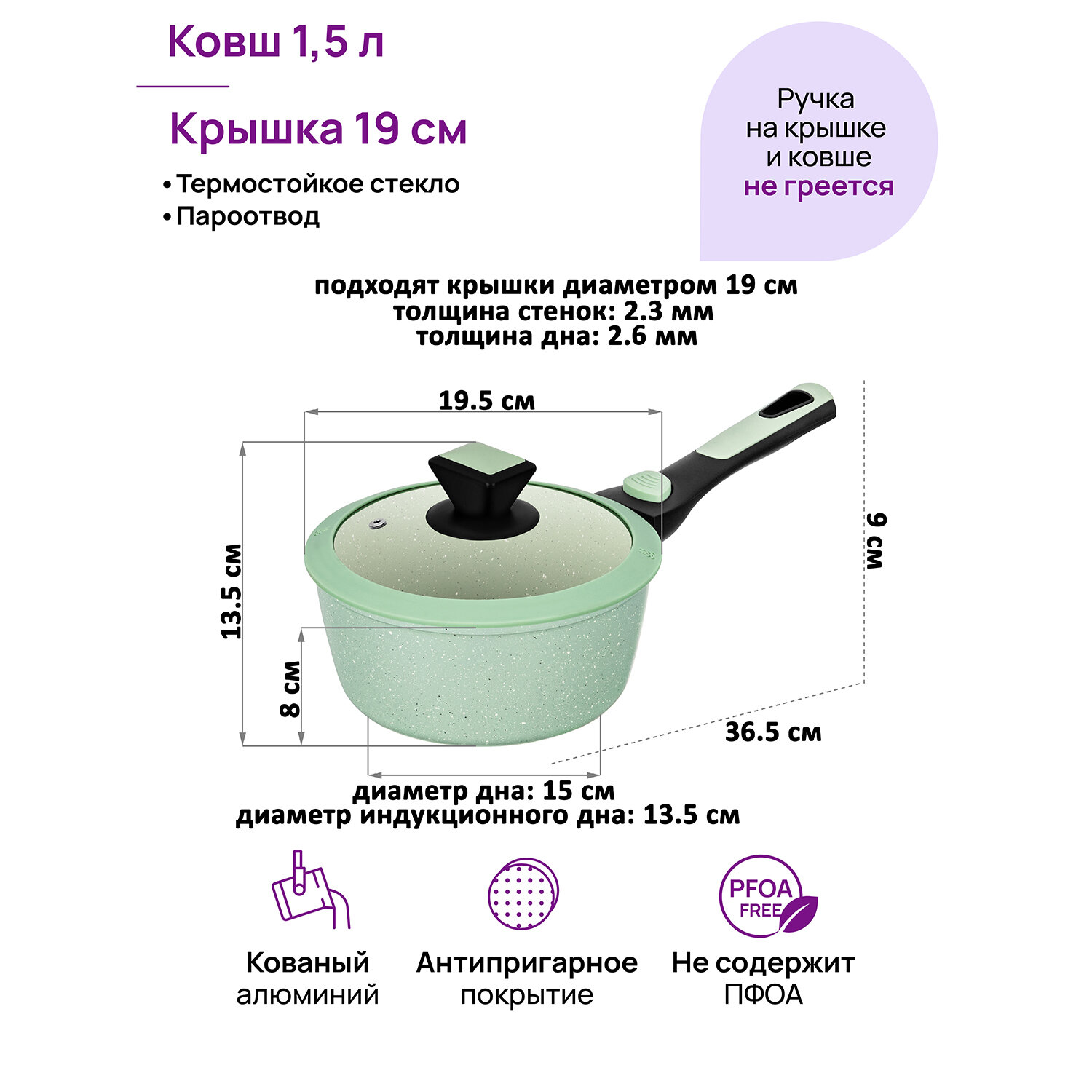 Ковш 1,5 л Elan Gallery FIERRA Зеленый мрамор, индукция, с крышкой ф19, со съемной ручкой информация:
