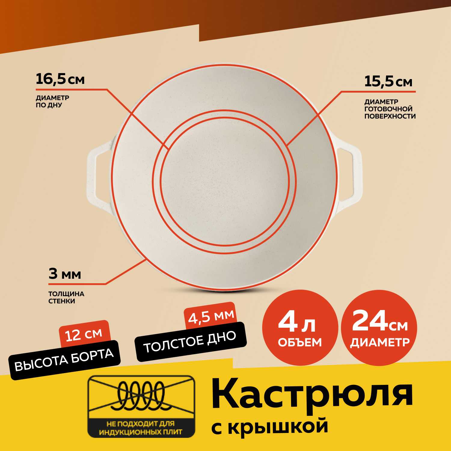 Кастрюля ALWA с крышкой 4 литра антипригарное покрытие, литая, цвет белый молочный информация: