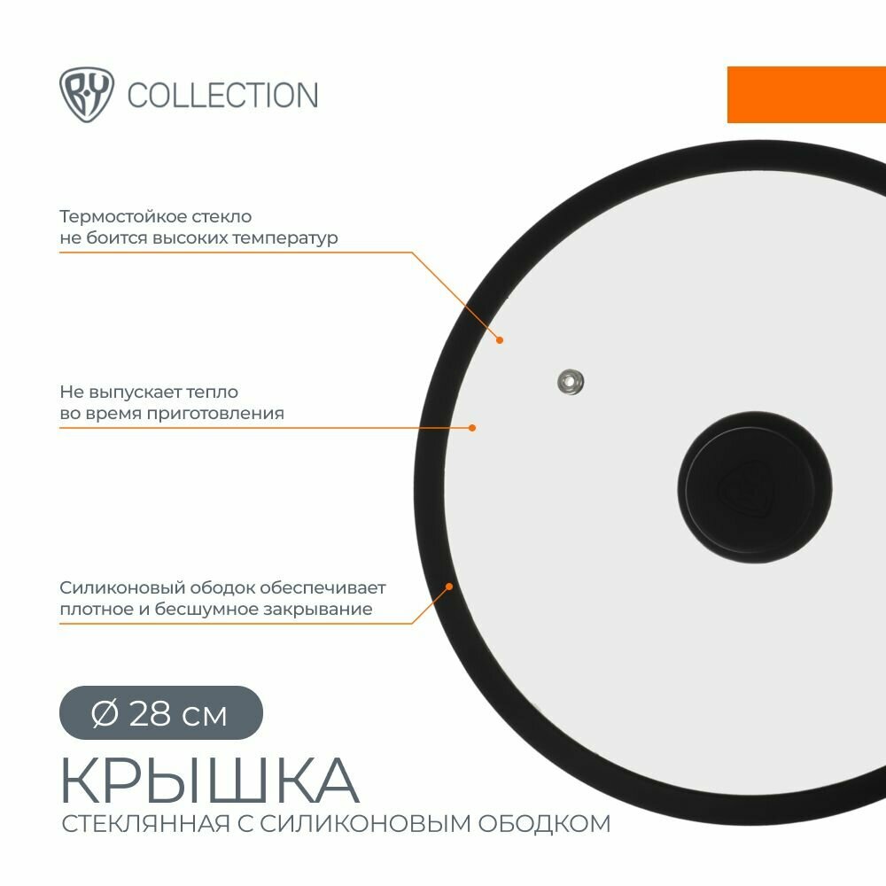 Крышка для сковороды 28 см BY COLLECTION, стеклянная крышка для кастрюли, термостойкое стекло, силиконовый ободок информация: