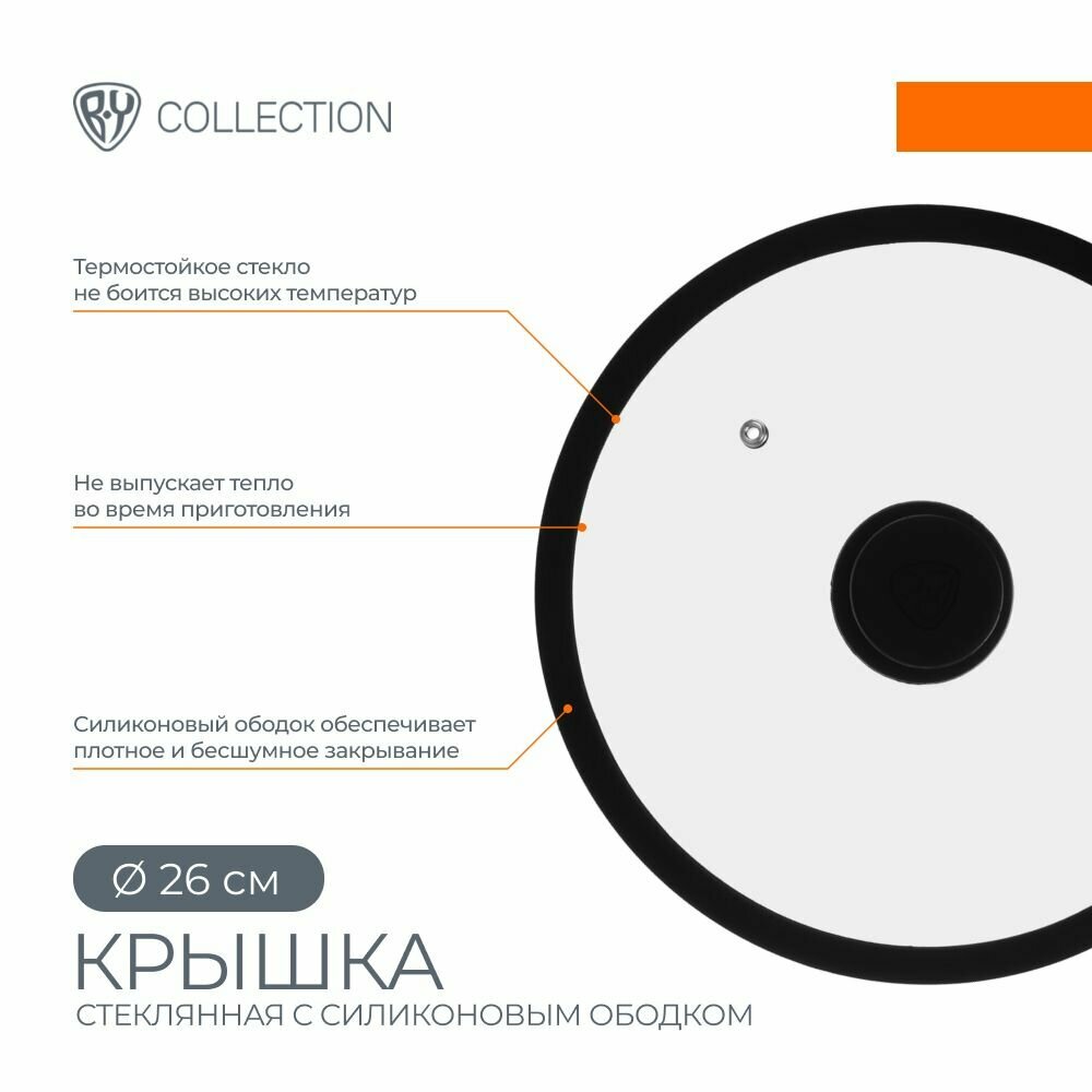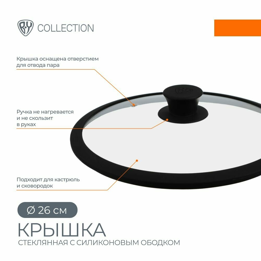 Крышка для сковороды 26 см BY COLLECTION, стеклянная крышка для кастрюли, термостойкое стекло, силиконовый ободок информация: