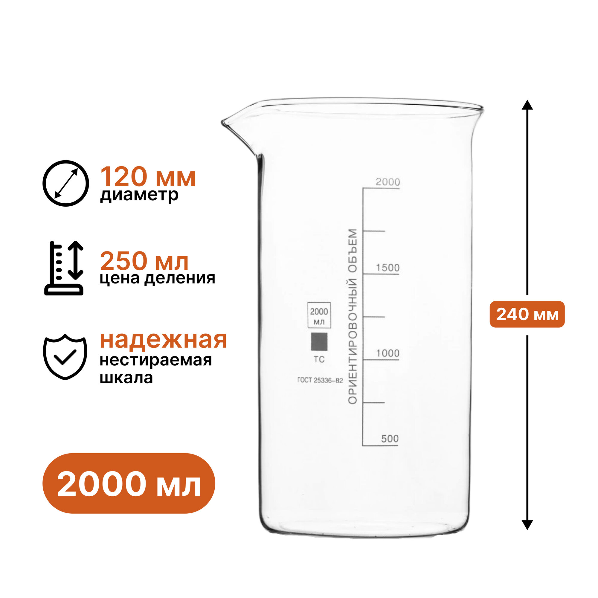 Стакан лабораторный 2000 мл (тип В, высокий с делениями и носиком, термостойкий) ТС В-1-2000 информация:
