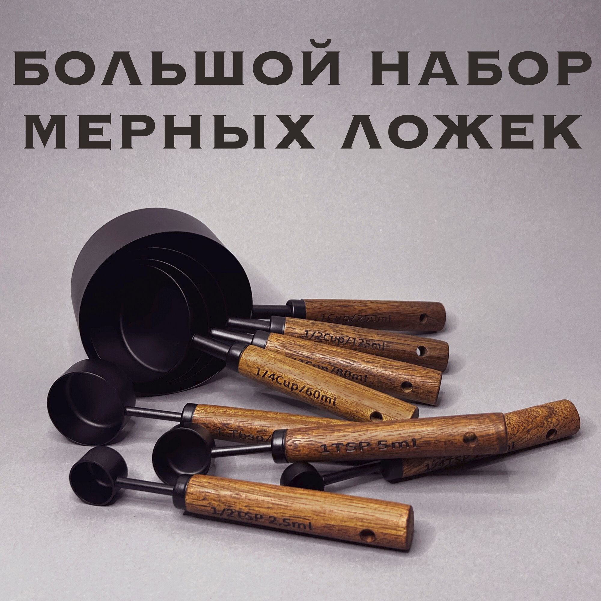 10 цен на Большой набор из 8 черных мерных ложек ФОРМА с деревянной ручкой