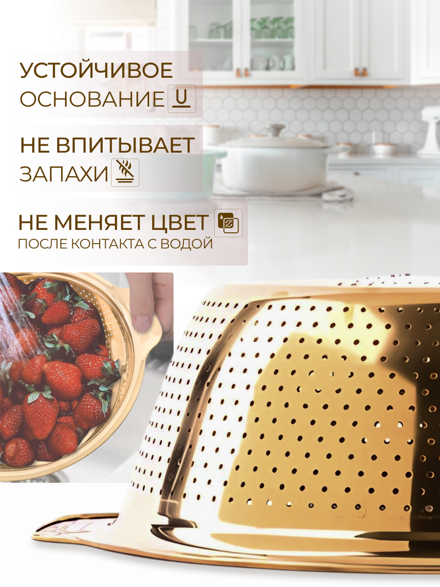 Отзывы на Дуршлаг с ручками 1.5 л. диаметром 22 см. золотистый нержавеющая сталь