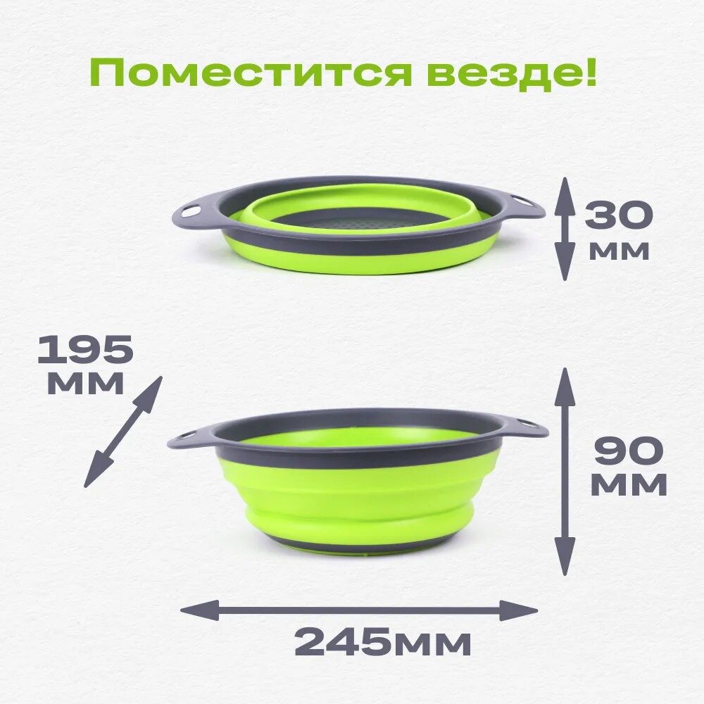 Дуршлаг складной силиконовый TAKARA NT1601 зеленый 2,5л, 19,5 см, сито с ручками для круп, макарон овощей и фруктов информация: