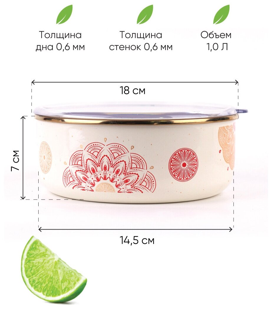 Миска эмалированная 18 см, 1 литр, акриловая крышка, Сияние, красный, Катюша, арт. 2022-100-2 информация: