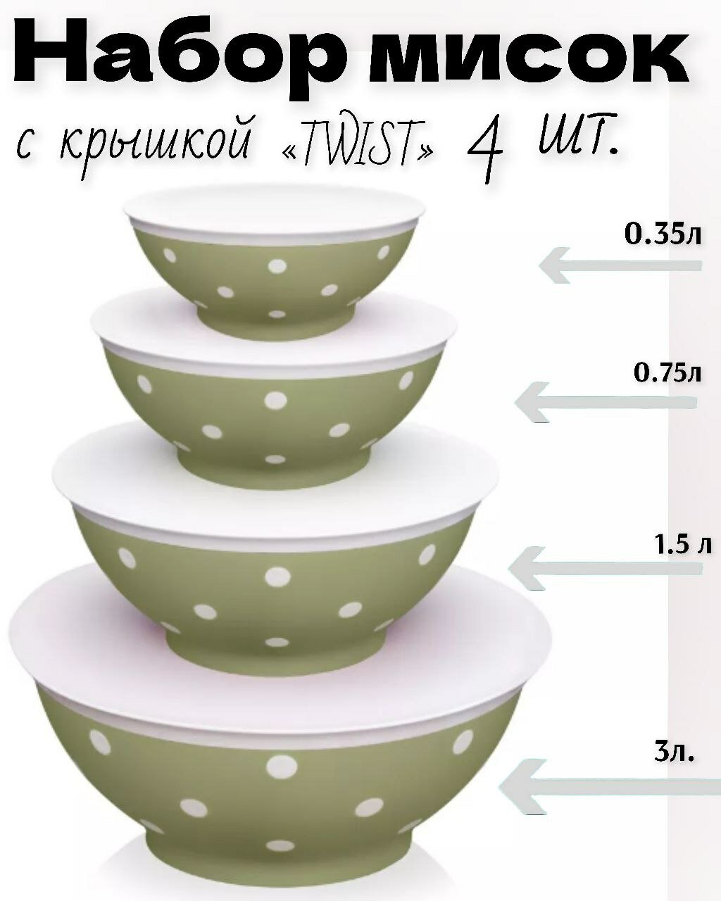 10 цен на Набор мисок с крышками, разных размеров,4 штуки, цвет- серо-зеленый .