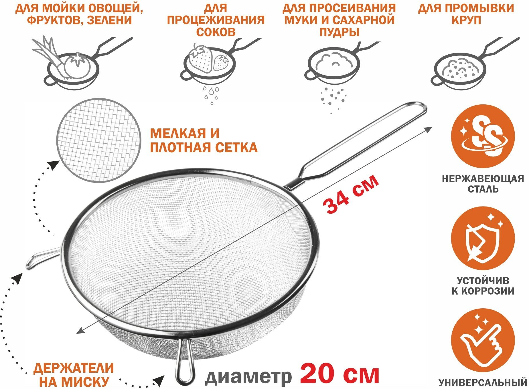 Дуршлаг с ручкой из нержавеющей стали PERFECTO LINEA 20 см (24-020020) информация: