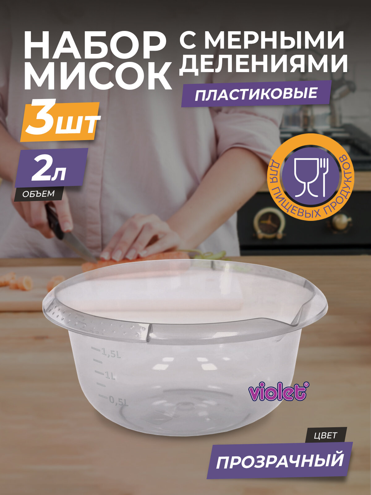 10 цен на Миска пластиковая с мерной шкалой 2л, набор 3шт, цвет прозрачный / чаша для салата / емкость для теста, миксера