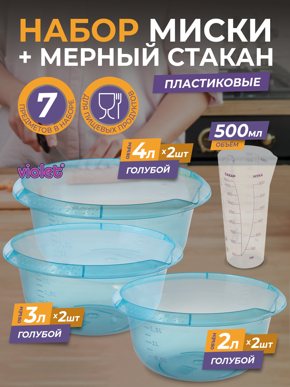 Отзывы на Набор из 7 предметов: Миски с мерным делением 2л - 2шт, 3л - 2шт, 4л - 2шт, цвет голубой, мерный стакан Поварёнок 0,5л