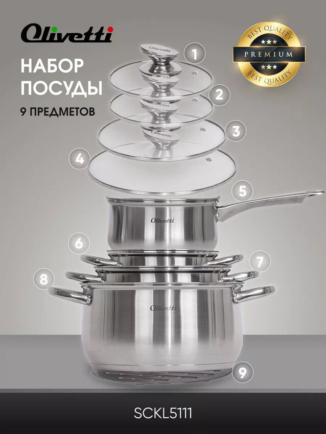 Olivetti SCKL5111. Набор посуды для приготовления с крышками 9 предметов, нержавеющая сталь информация: